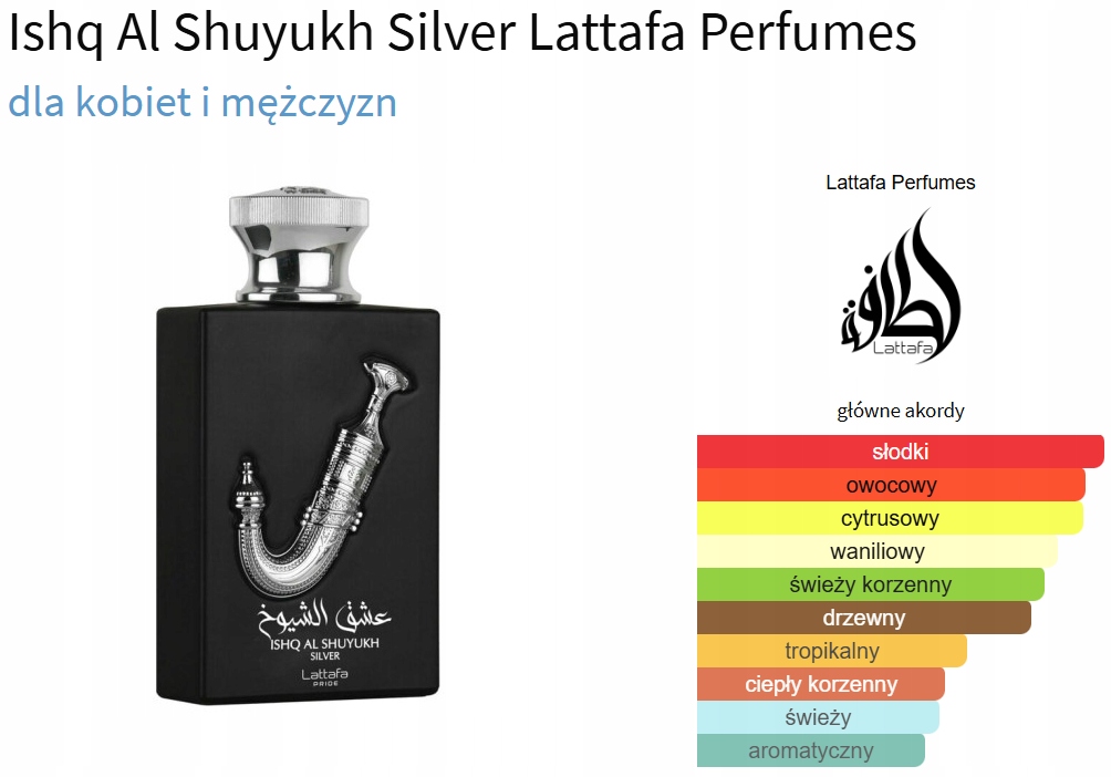 ishq al shuyukh silver от латтафы духи - янтарный духи для мужчин и женщин, которые были выпущены в 2022 году. Сердце Примечания: Ананас и черный перец; базовые примечания: ваниль, кедр, янтарный дерево и пачули. Ароматическая база сладкая и бальзамическая, с четкими нотами ванили и пачули. Это идеальный выбор для людей, которые любят восточные ииндизионные духи с оттенком свежести. Глубина «». Это идеальный запах для холодных дней. Дерево и бальзамический. Это отличный выбор для людей, которые ценят оригинальные и прочные запахи
