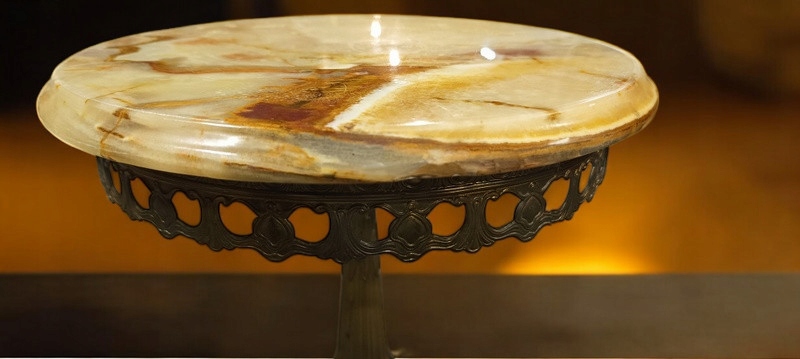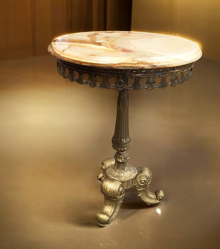 Латунный стол со столешницей из оникса (разновидность мрамора).