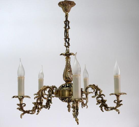 продает красивую латунную пяти, наполненную люстрой в стиле свечи (лампы не включены только для фотографии) идеально подходит для комнаты с высотой от 2,40 до 2,85 м. Расположен в люстрой составляет около 57 см, общая высота 59 см, маленькие резьбы E14, емкость лампочки макс 60 Вт. Люстра стреляется в 2 раза (2 из 3)