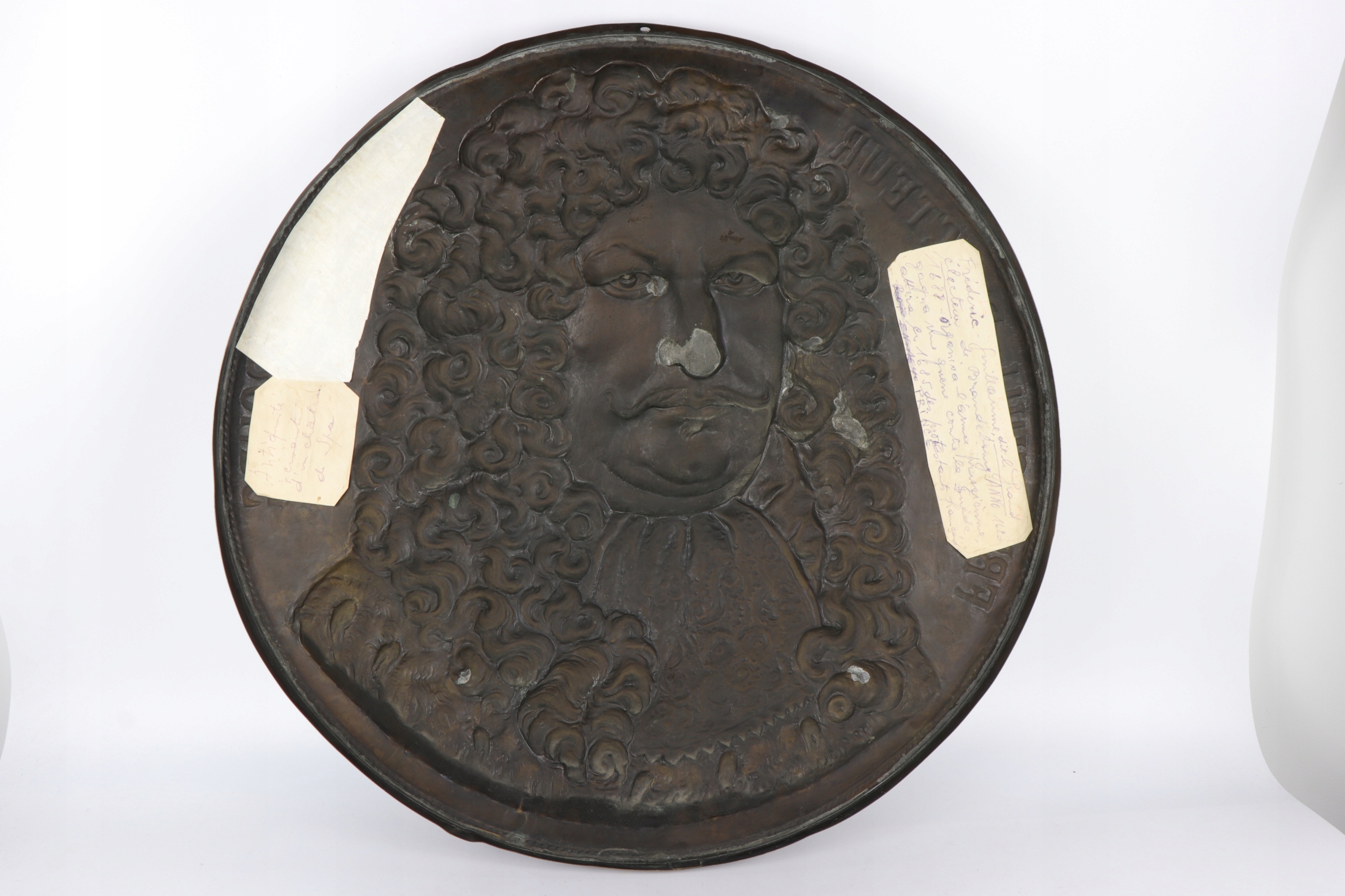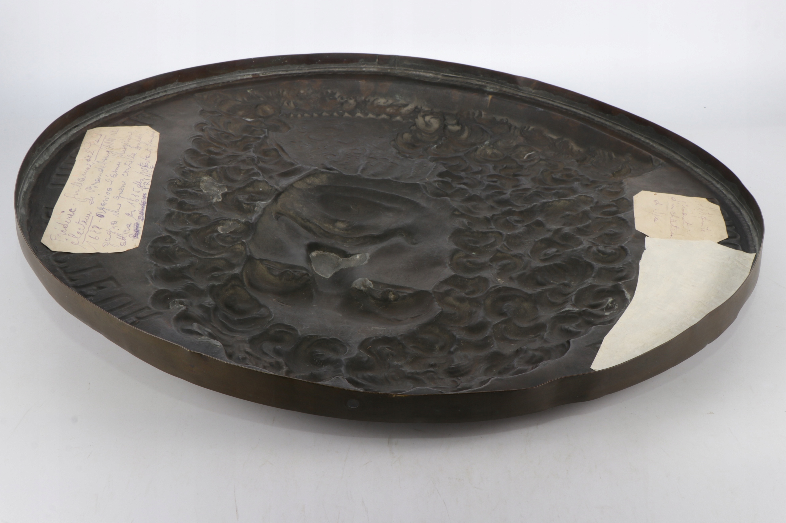 Старая очень интересная медная табличка с изображением Фредерика Вильгельма и избирателя Бранденбурга под названием «Великий Электор». Половина надпись «Фред Гил Электройр де Брандебург» под лицом надписи Лорда Бранденбурга с 17 -го века. Доска, сделанная из тонкого латунного листа. По моему мнению, табличка с девятнадцатого века с видимой темной очень хорошей патиной.