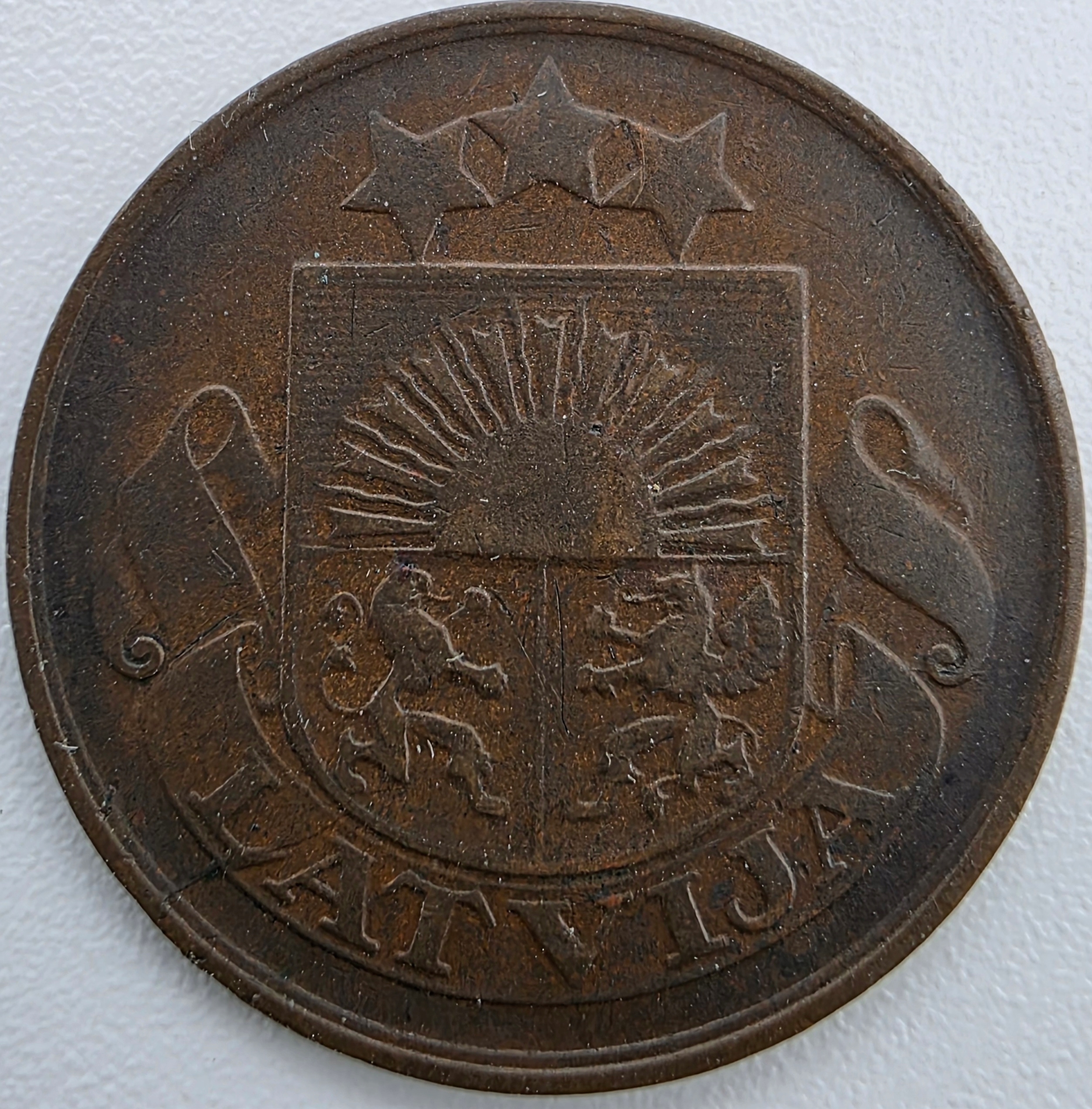 Латвия - 2 сантима 1922 года, лев, солнце, три звезды, интересная монета