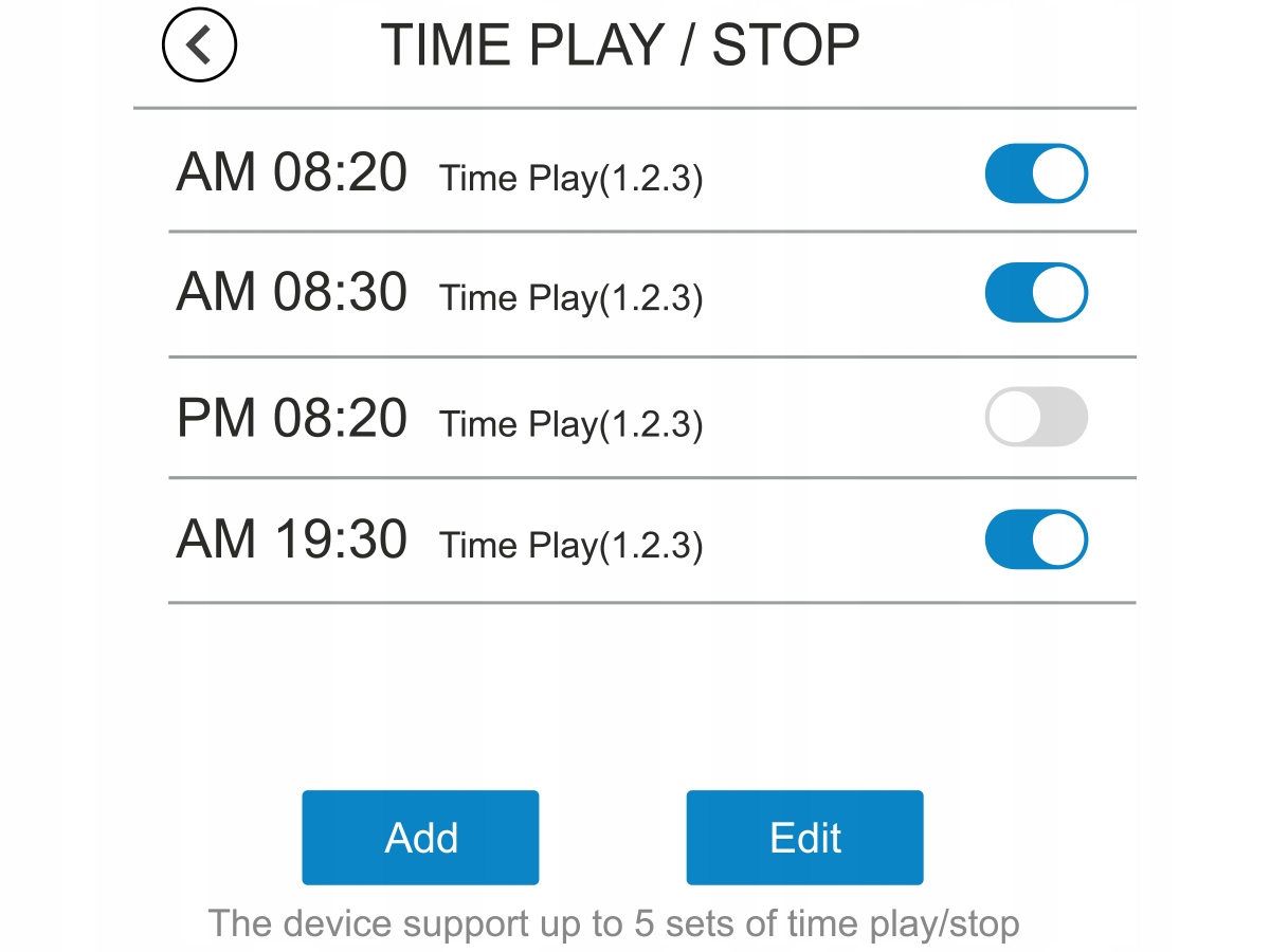 Настенная панель поддерживает до 5 записей автоматического воспроизведения музыки. Это полезная функция, используемая, в частности, в медицинских учреждениях и других типах общественных помещений или помещений общественного питания. Просто выберите песню с карты памяти, а затем день недели и конкретное время, в которое музыка начнет автоматически воспроизводиться... и все! Помимо воспроизведения музыки в определенное время, вы также можете запрограммировать время остановки музыки.