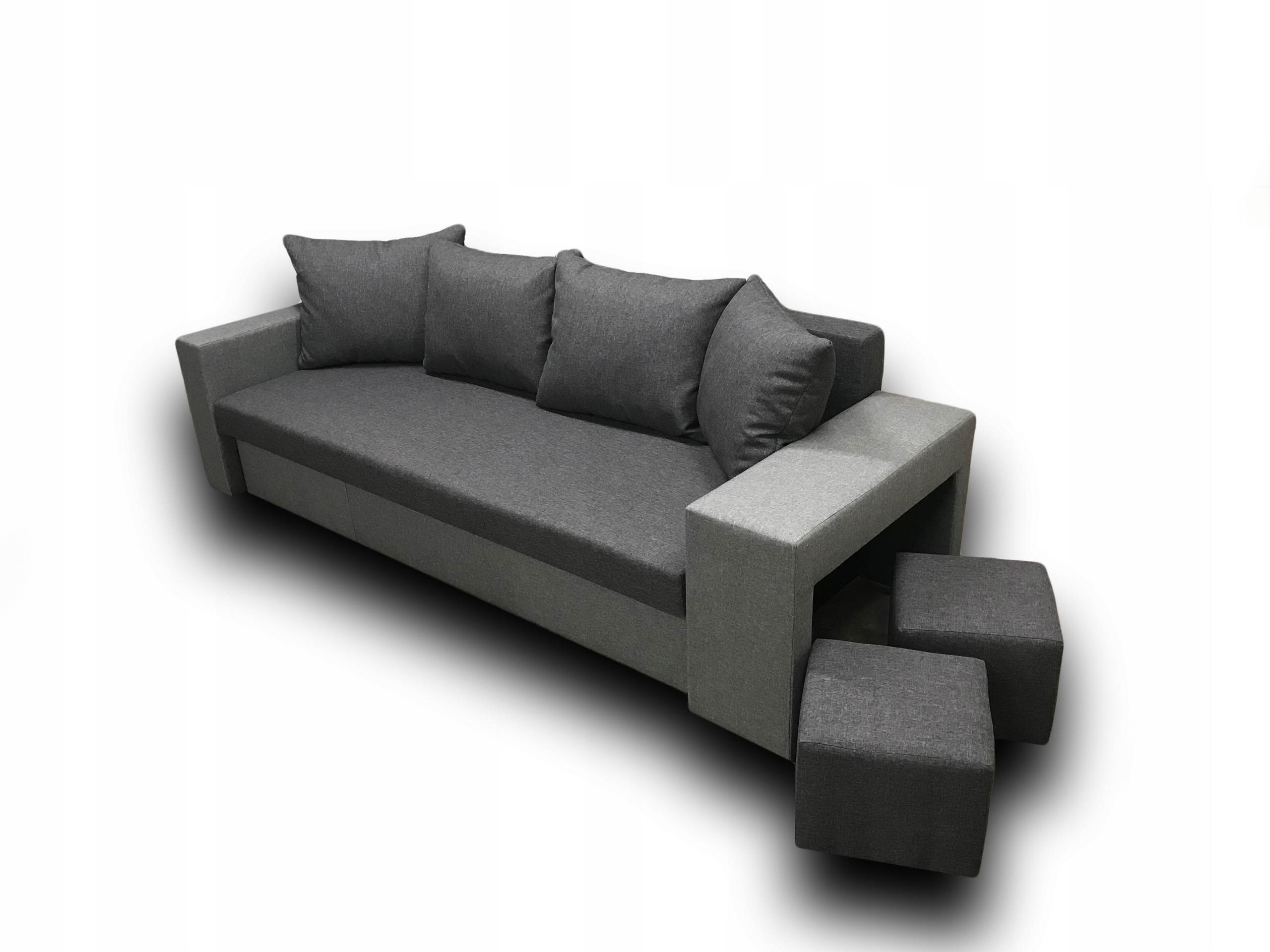 У этого предмета мебели одна из сторон специально разработана для вмещают два пуфа, и они не мешают нам, когда они нам не нужны, в цену включены два пуфа в цвет сиденья.