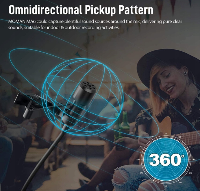 Звуковой сигнал на 360 градусов. Благодаря разнонаправленному конденсаторному капсюлю на 360° MOMAN MA6 может захватывать несколько источников звука вокруг микрофона, что подходит для записи в помещении и на открытом воздухе.