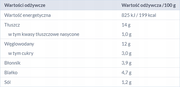 Состав: Фасоль белая - 50% (фасоль белая, зерна - 42%, вода, соль), вода, масло рапсовое, сельдерей маринованный (сельдерей, вода, регулятор кислотности: лимонная кислота), лук репчатый, семена подсолнечника, сушеные подслащенные. клюква (клюква сушеная, сахар, масло подсолнечное), соль, сахар, петрушка - 0,6%, лук сушеный, перец черный, майоран сушеный - 0,25%, регулятор кислотности: лимонная кислота, тмин, чеснок