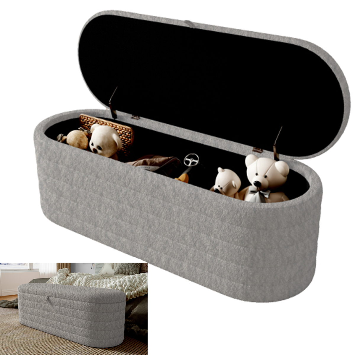 ЛАВКА М'ЯКИЙ ПУФ З ВІДСІКОМ ДЛЯ ЗБЕРІГАННЯ СПАЛЬНІ ВЕДМЕДИК ОКСАМИТОВИЙ СІРИЙ