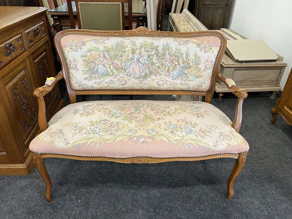 Старинная скамейка в стиле Людвик, обитая красивым цветочным узором.