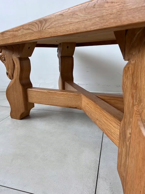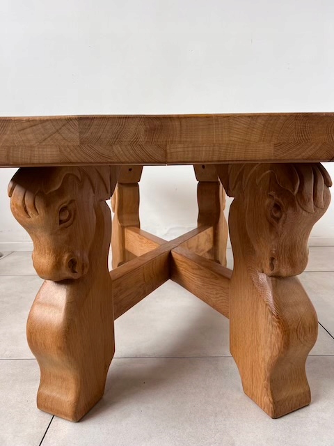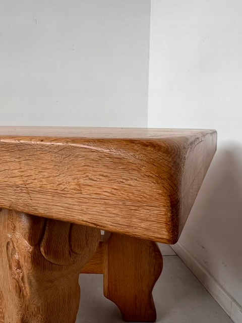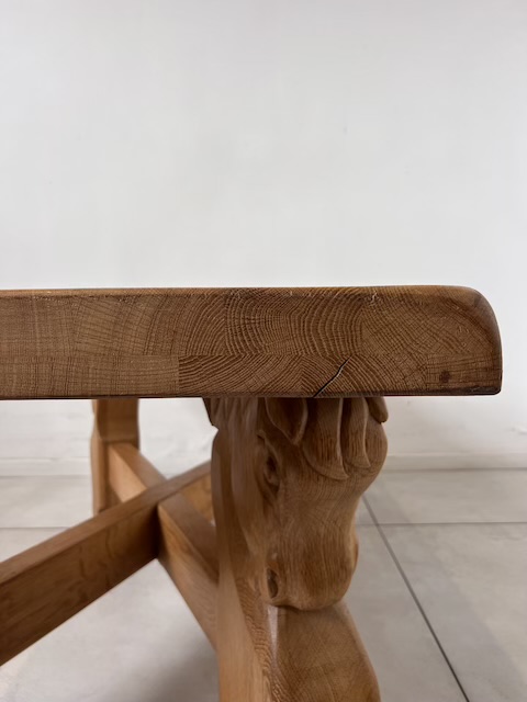 Дубовая скамейка из массива дерева. Он тяжелый, массивный. Ножки украшены конскими мотивами и соединены стильным крестом. Единственный недостаток - царапины на столешнице. Они подробно показаны на фотографиях. Других повреждений и дефектов нет. Скамейка готова к установке.