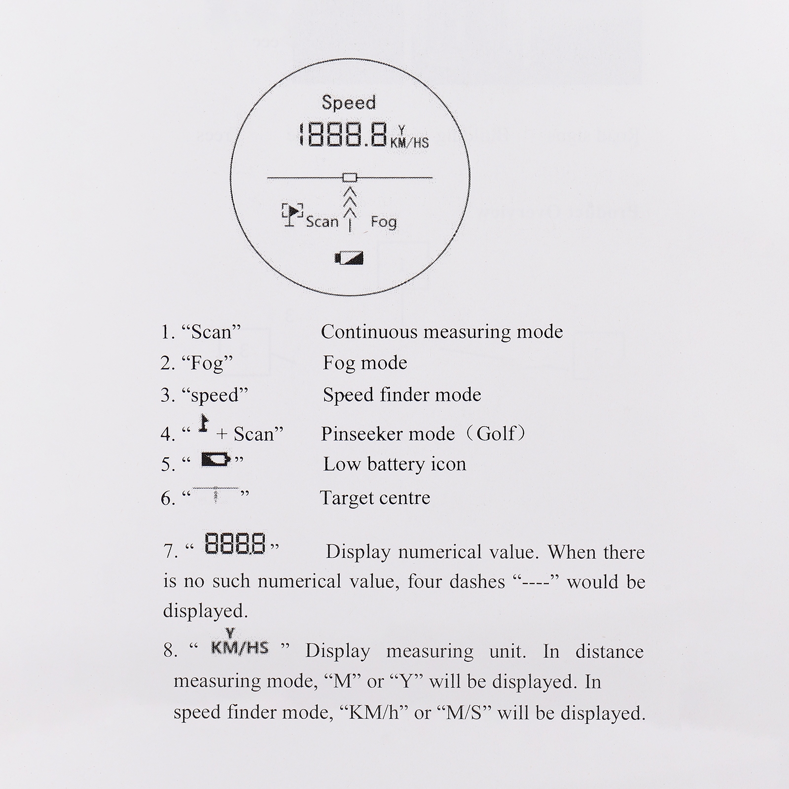 1. [4 режима] поддерживает режим непрерывного измерения, режим тумана, режим скорости поиска и режим Pinseeker (гольф). Тревога с низкой батареей напоминает вам замену батареи.