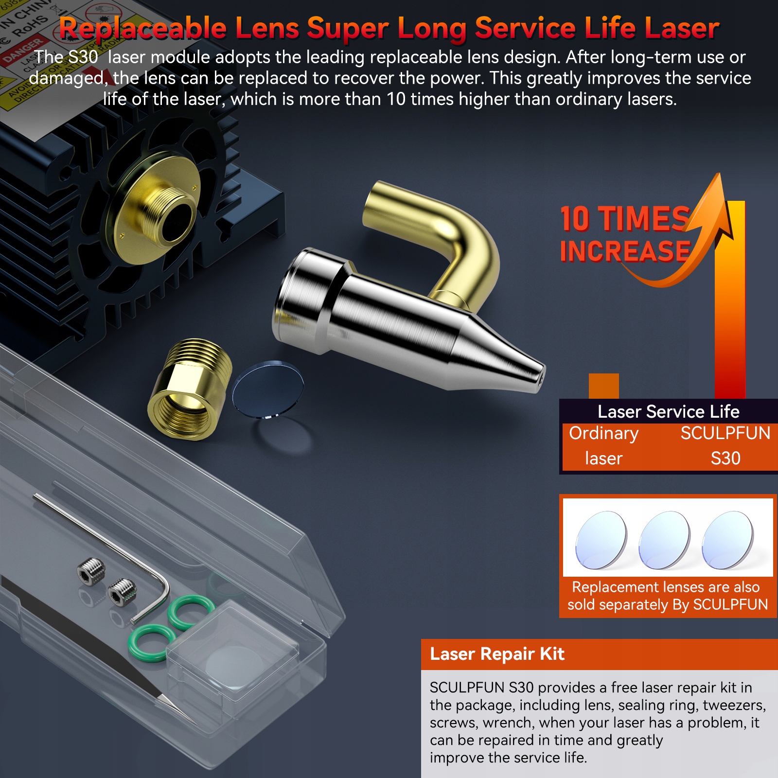 ▶ Заменяемая защитная линза: она требует инновационной заменяемой линзы, значительно улучшает срок службы лазера, который в 10 раз больше, чем в случае других общих лазеров. В случае повреждения объектива или после длительного использования его можно заменить, чтобы восстановить силу резки. Бесплатный объектив прикреплен к покупке. Больше линз можно легко купить в магазине Sculpfun.