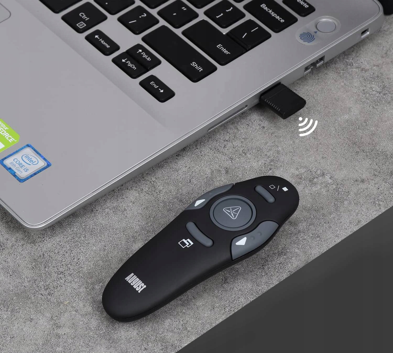 Пульт дистанционного управления работает с PowerPoint. Благодаря функциональным кнопкам вы можете свободно менять слайды. Устройство питается от батареи AAA (не входит в комплект).