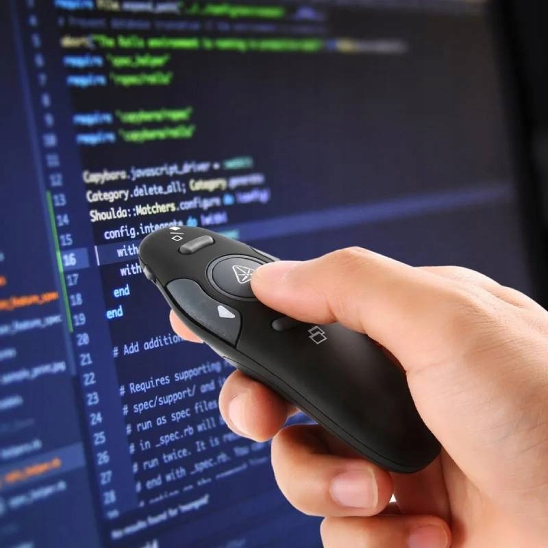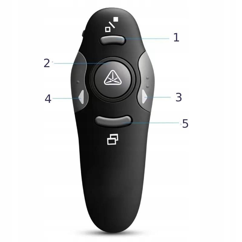 Красный лазер позволит вам свободно указывать на наиболее важные элементы презентации на максимальном расстоянии 200 метров. Кнопки позволяют переключать слайды вперед и назад, выключать экран или выключать устройство. Устройство имеет радиус действия до 15 метров.