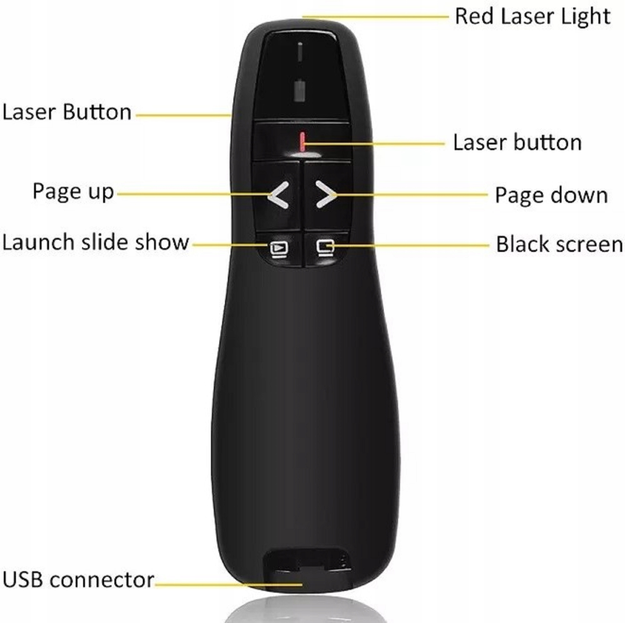 ФУНКЦИИ. Благодаря лазеру вы сможете показать аудитории самую важную информацию в вашей презентации. Удачно расположенные кнопки позволяют переключать слайды вперед и назад, выключать экран или выключать устройство. Это хороший подарок для людей, проводящих презентации.