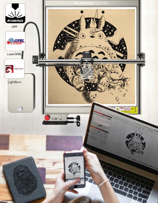 Мы разработали приложение ATOMSTACK для подключения к лазерному гравировальному станку S20 pro, поддерживающему системы мобильных телефонов Android и Apple. В то же время он оснащен контроллером и кнопкой аварийной остановки, поэтому вы можете выполнять гравировку полностью в автономном режиме. Вы можете гравировать плавно и безопасно даже без сетевого окружения или компьютера.