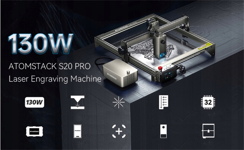 Atomstack S20 PRO — первый твердотельный лазерный гравер мощностью 130 Вт. Он использует новейшее поколение четырех технологий лазерной связи мощностью 6 Вт для достижения выходной мощности, возрастающей до 20 Вт. Он может резать Доска из тунга толщиной 15 мм и черная акриловая доска толщиной 8 мм за один проход позволяют легко резать более 40 видов материалов, таких как плита из нержавеющей стали толщиной 0,05 мм.