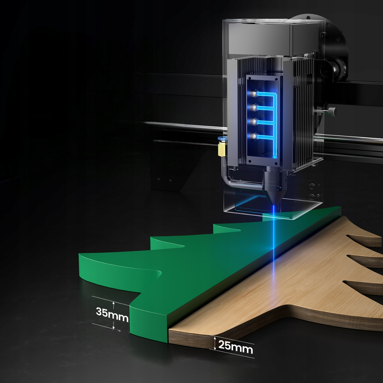 Ray5 20W оснащен мощным лазерным модулем оптической мощности 20 Вт, который оснащен самой передовой лазерной технологией и повышает эффективность резки этого станка. Он может резать сосну толщиной 0,59 дюйма/15 мм и акрил толщиной 0,31 дюйма/8 мм за один проход, древесину толщиной 25 мм и акрил толщиной 35 мм за несколько проходов, а также резать нержавеющую сталь толщиной 0,002 дюйма/0,05 мм.