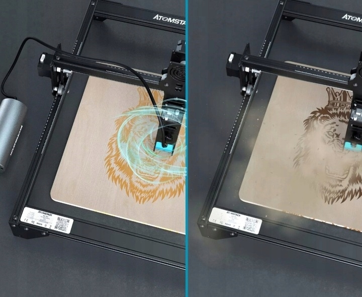Мощный воздушный поток ATOMSTACK Air Assist быстро снижает температуру поверхности вырезанного/выгравированного изделия, предотвращая пережог и обеспечивая более чистые и гладкие режущие кромки.