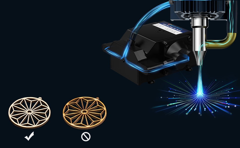 Традиционная система подачи воздуха адаптера всегда включена и не может управляться во время гравировки, а выгравированный рисунок превратится в размытый туман. Серия S30 оснащена 32-битной материнской платой Airassist и воздушным насосом управляющего типа, который может интеллектуально управлять переключателем подачи воздуха во время гравировки с помощью кнопки M8 программного обеспечения LightBurn, что делает гравировку и резку очень чистыми и очень подходит для изготовления изысканных подарков. .