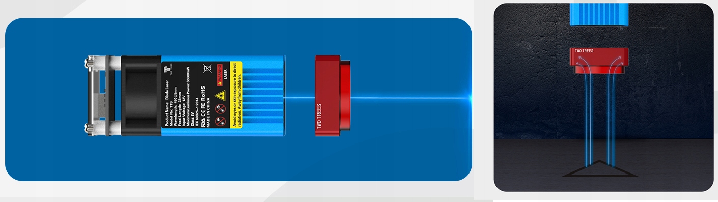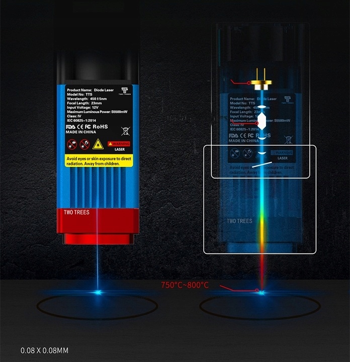 В лазерном модуле TTS-55 PRO используется новейшая технология сжатия точек LD+FAC+C-Lens, обеспечивающая постоянную резкость при фокусном расстоянии всего 23 мм. По сравнению с другими длиннофокусными лазерами, этот короткофокусный лазер обеспечивает превосходные характеристики гравировки и резки, обеспечивая точность гравировки 0,1 мм.