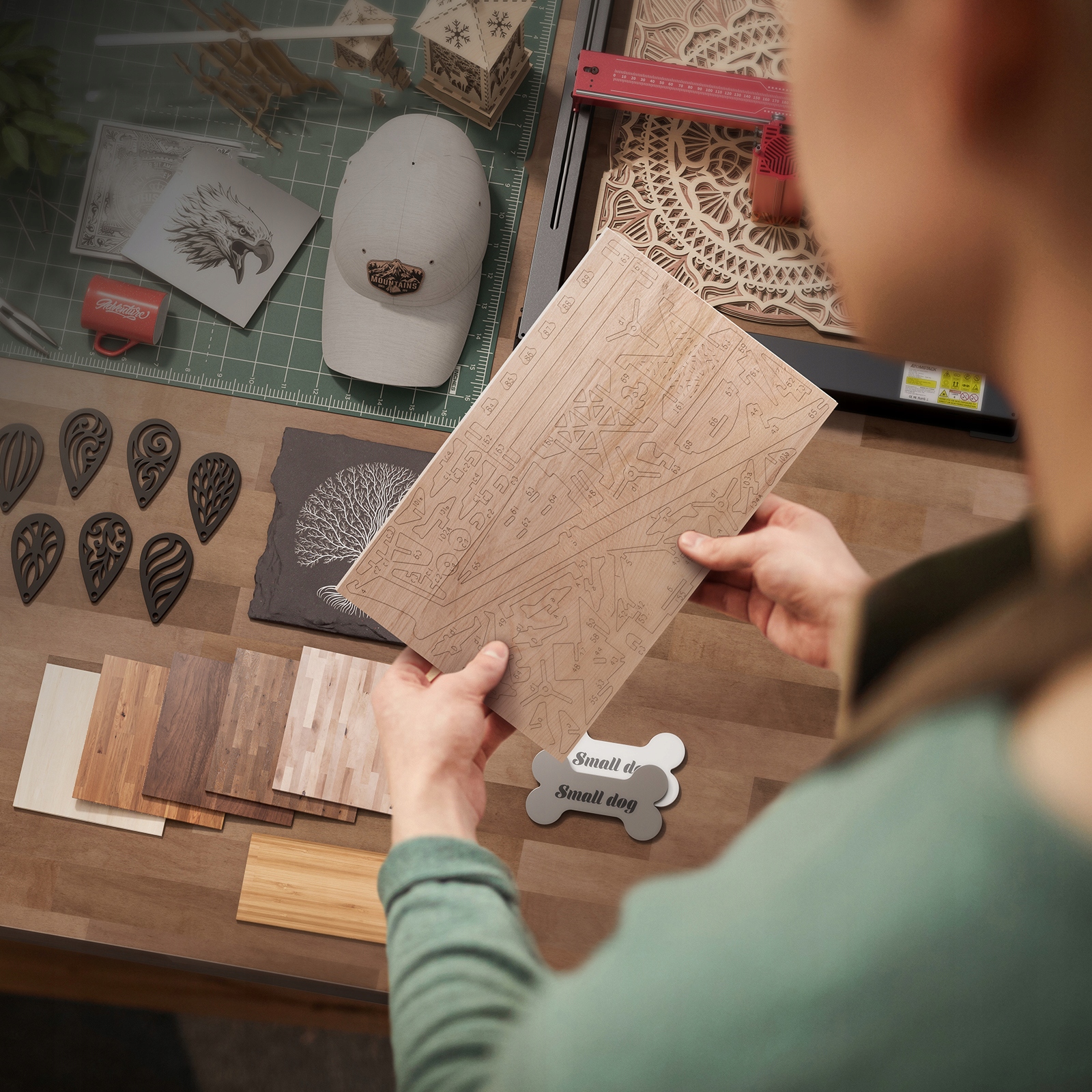 - Материалы для резки: картон, флизелин, деревянные доски, фанера, акрил (прозрачный следует покрасить в черный цвет), несколько тонких пластиковых досок, губки, алюминий и нержавеющая сталь. сталь и другие листы;