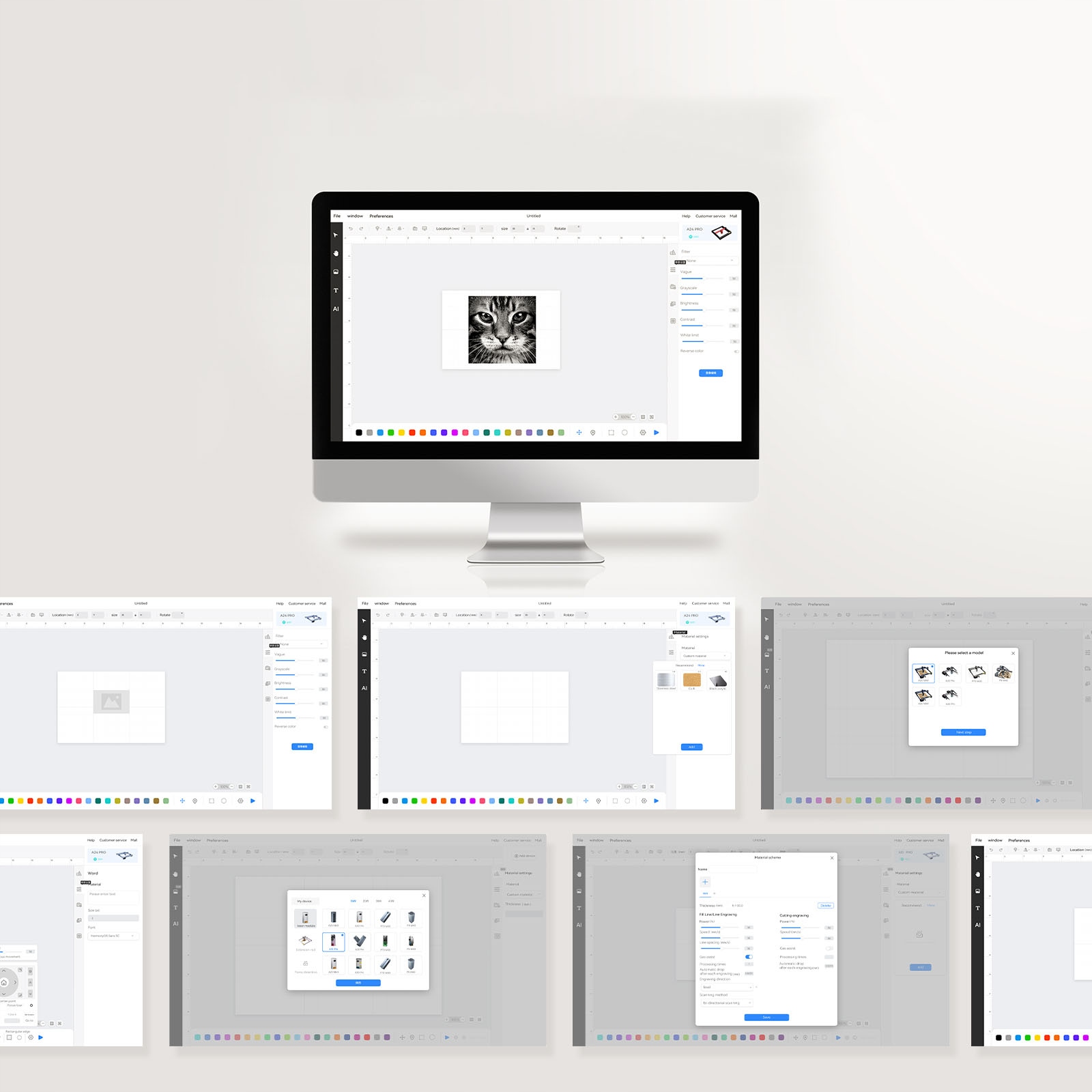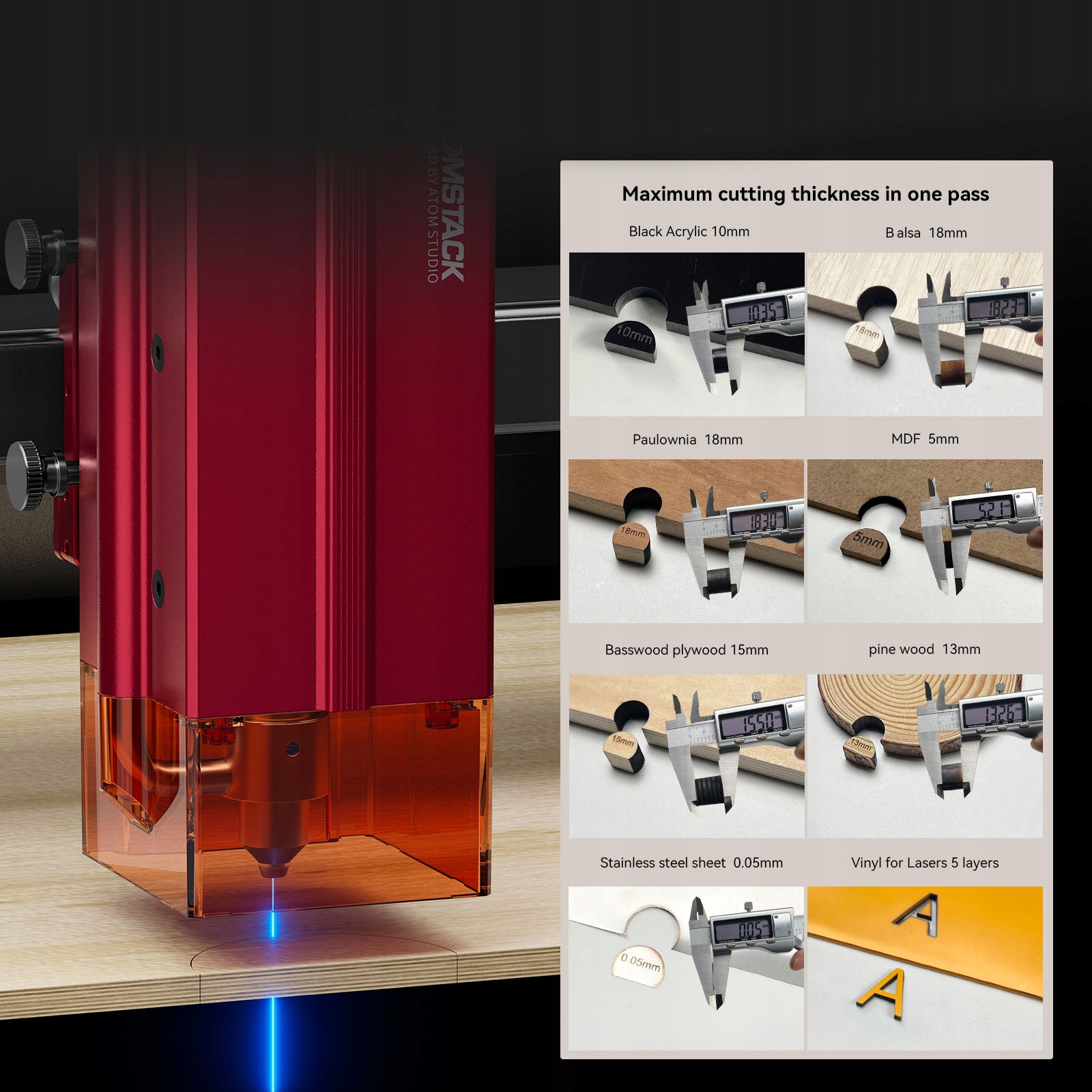 - Материалы для резьбы: дерево, бамбук, картон, пластик, кожа, печатная плата, оксид алюминия, гальванический и неотражающий лаковый металл, зеркальная нержавеющая сталь 304, стекло, керамика, х/б ткань, шифер;