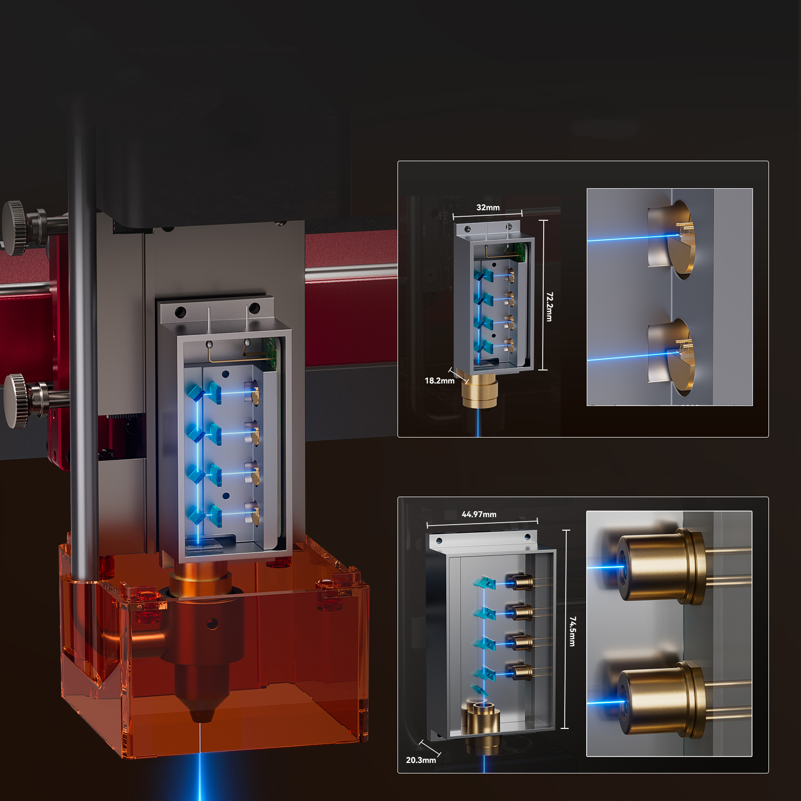 11. Улучшенная технология соединения сжатых точек: Высокоточная область фокусировки лазера уменьшена до 0,06*0,06 мм. Лазер высокой плотности может легко разрезать фанеру толщиной 20 мм и черный акрил толщиной 30 мм; Он может напрямую гравировать зеркальный металл из нержавеющей стали, керамику, стекло, скорость гравировки и резки на 40% выше, чем у обычной модели, а экстремальный эффект резки сравним с гравировальным станком с CO₂-лазером мощностью 300 Вт.