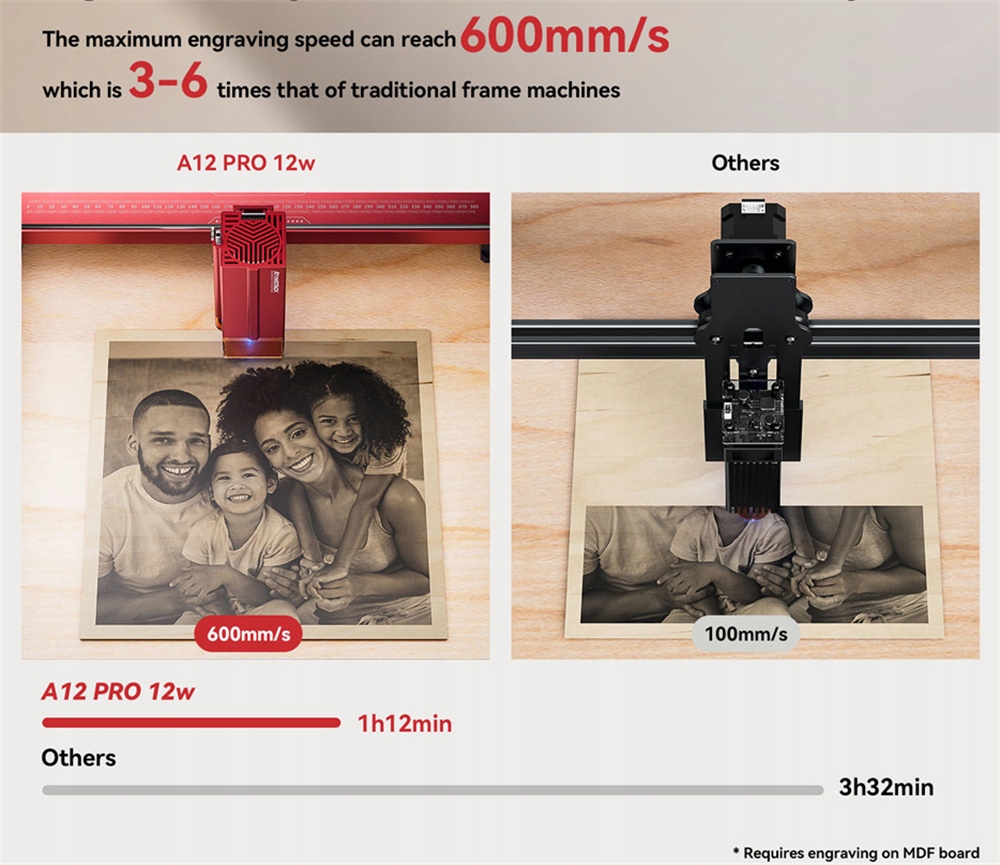 ATOMSTACK A12 Pro использует самый стабильный и высокопроизводительный лазерный модуль мощностью 12 Вт, который может резать такие материалы, как деревянные панели колокольчика толщиной 8 мм и черные акриловые плиты толщиной 8 мм и толщиной 5 мм. один раз. Он имеет конструкцию с фиксированным фокусом, которая обеспечивает быструю и точную фокусировку за 10 секунд. Максимальная скорость гравировки ATOMSTACK A12 Pro составляет 600 мм/с, что в 3-6 раз быстрее, чем у обычных рамочных устройств.