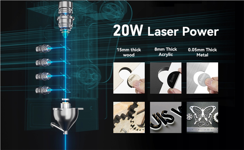 Atomstack S20 PRO — это первый твердотельный лазерный гравер мощностью 130 Вт. Он использует новейшее поколение четырех лазерных технологий мощностью 6 Вт для достижения выходной мощности, возрастающей до 20 Вт. Он может Разрежьте доску из тунга толщиной 15 мм и черную акриловую плиту толщиной 8 мм за один проход и легко разрежьте более 40 видов материалов, таких как плита из нержавеющей стали толщиной 0,05 мм.