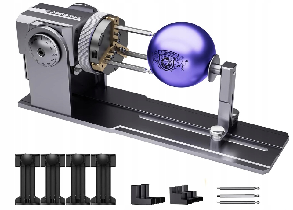 2. Многофункциональность: номиналы роликов Atomstack для гравировки цилиндрических поверхностей, банок, круглых деревянных палочек и т. д. (1–130 мм); предметы особой формы: чашки с ручками, стаканы, цилиндры особой формы и т.п.; Мячи: бейсбольные мячи, стеклянные шары, мячи для настольного тенниса и другие круглые мячи (4-200 мм); Кольца: кольца, браслеты и т. д. (4-130 мм);