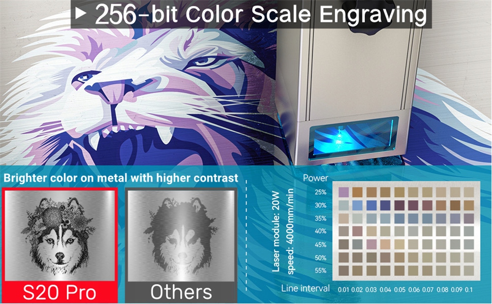 Встроенная 256-битная цветовая шкала, обеспечивающая лучший результат гравировки и более высокий контрастный эффект. Теперь ваши рисунки больше не будут просто черными.
