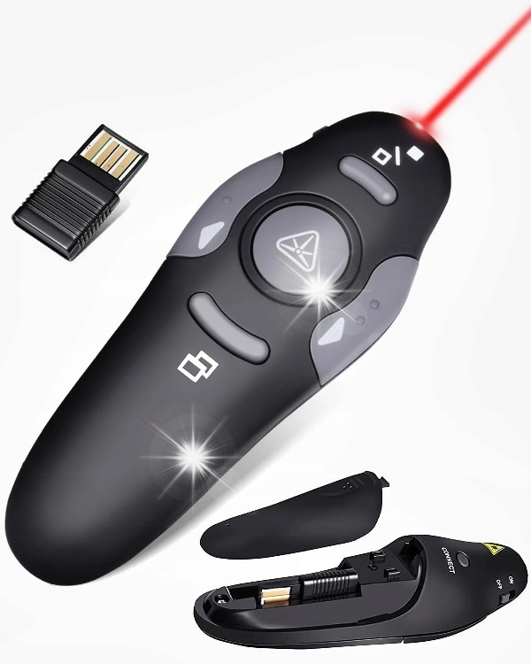 Приемник, прикрепленный к пульту дистанционного управления, работает при 2,4 ГГц. Устройство работает по принципу Plug & Play и не требует установки каких -либо дополнительных драйверов. Просто нажмите кнопку подключения на задней паре. Индикатор совместим с Windows 2003, XP, Vista, 7, 8, 10, Mac OS, Linux и поддерживает такие программы, как Keynote, Google Slides, MS Word, Excel, PowerPoint, веб -сайт, PDF