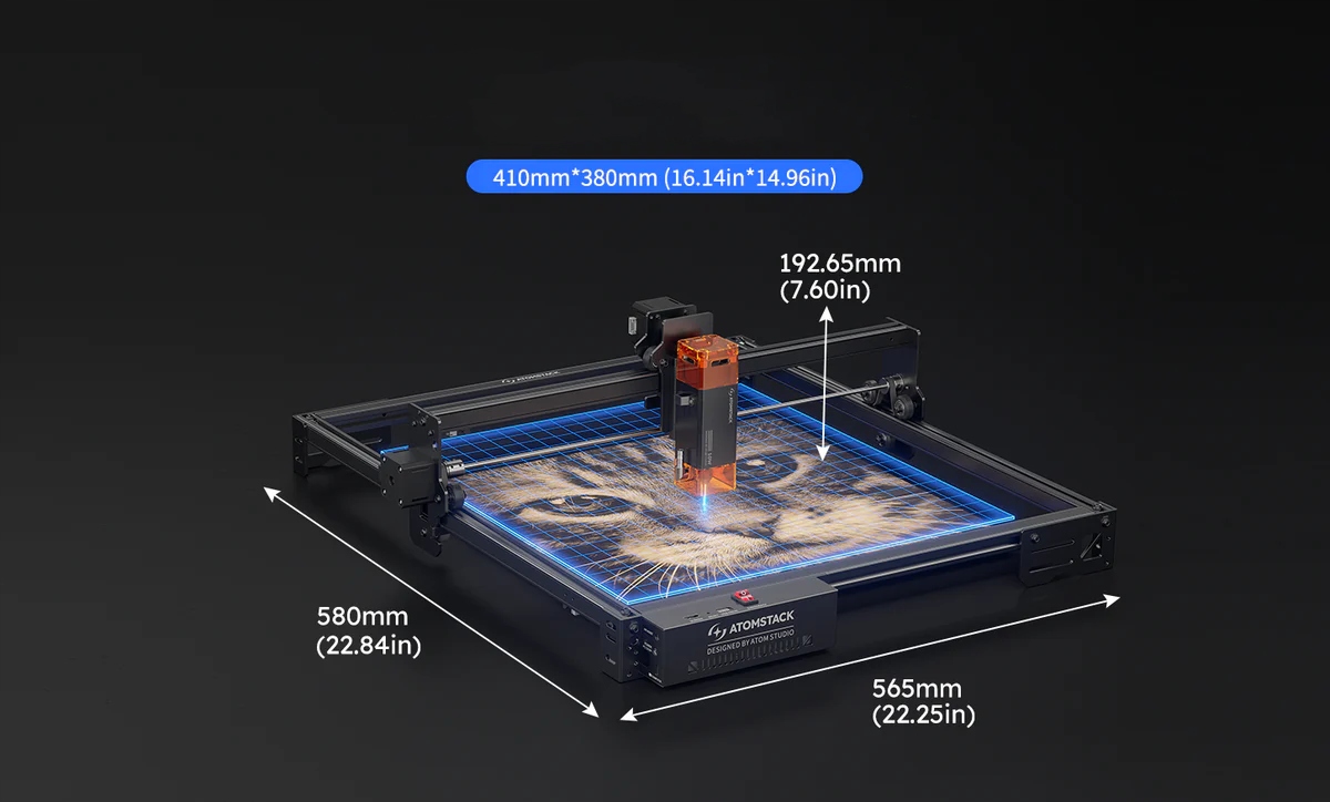 лазерный резак и гравюра просты и быстро устанавливают. Лазерная гравюра предлагает область гравировки 410 х 380 мм. Съемная магнитная лазерная защитная крышка и доставленные защитные очки могут защитить глаза во время работы.