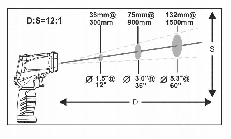 Для представленного пирометра оптика составляет 12: 1, поэтому пятно будет в 12 раз меньше расстояния от объекта.