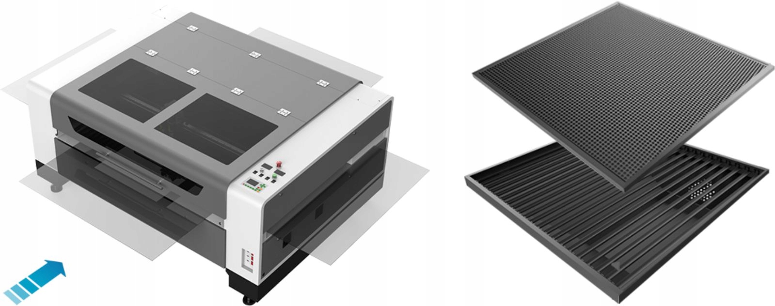 В стоимость лазерного плоттера входят: красная точка, автофокус, электрически опускаемая платформа до 300 мм, сотовая накладка и ножничный стол, два экстрактора выхлопных газов: верхний и нижний с Ящик для отходов, встроенный, активируется для работы компрессора, вентилятора и охлаждения.