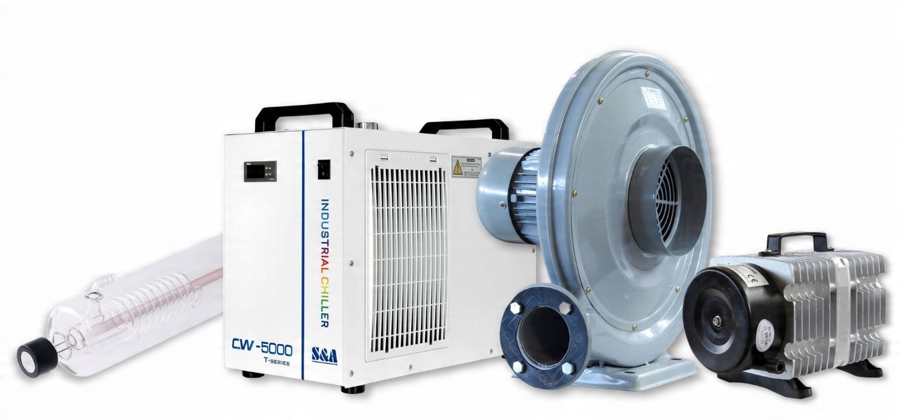 Стандартное оборудование включает в себя лазерную трубку, жидкий охладитель CW5000, компрессор для блюсной линзы и материала, а также дым.