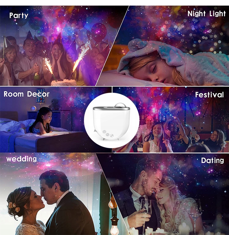 ● Идеальный подарок для детей, семьи, друзей и близких. Создает звездную атмосферу, идеально подходящую для домашнего декора, вечеринок, свадеб, DJ-баров, декора игровой комнаты, фестивалей. Ритм ночного неба и ореол проектора вдохновляют детей на творчество и спокойствие.
