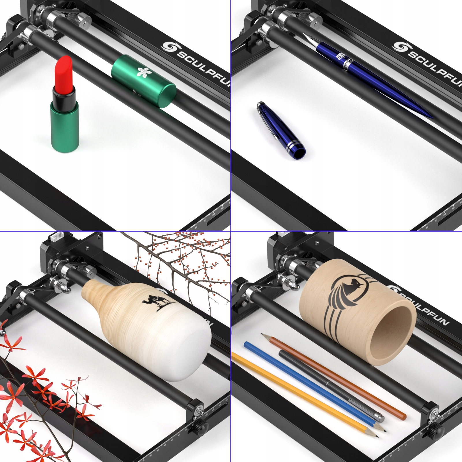4. 100% оригинальная высокоточная гравировка: в ролике SCULPFUN используется резиновый ролик с высоким коэффициентом трения 70А для предотвращения скольжения, а линейная скорость вращающейся поверхности была точно рассчитана. Подключите кабель гравировального станка напрямую, чтобы выгравировать исходное изображение в масштабе 100%. Он не увеличивает и не уменьшает изображение.
