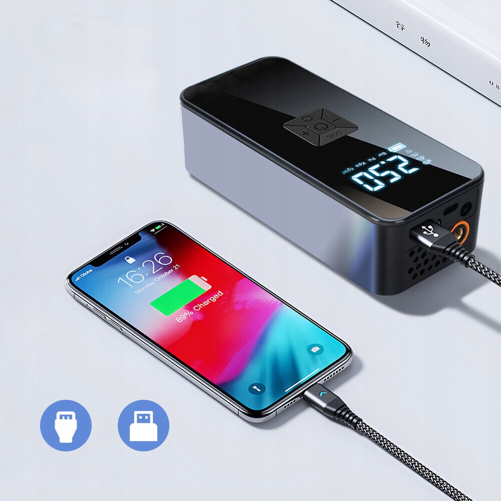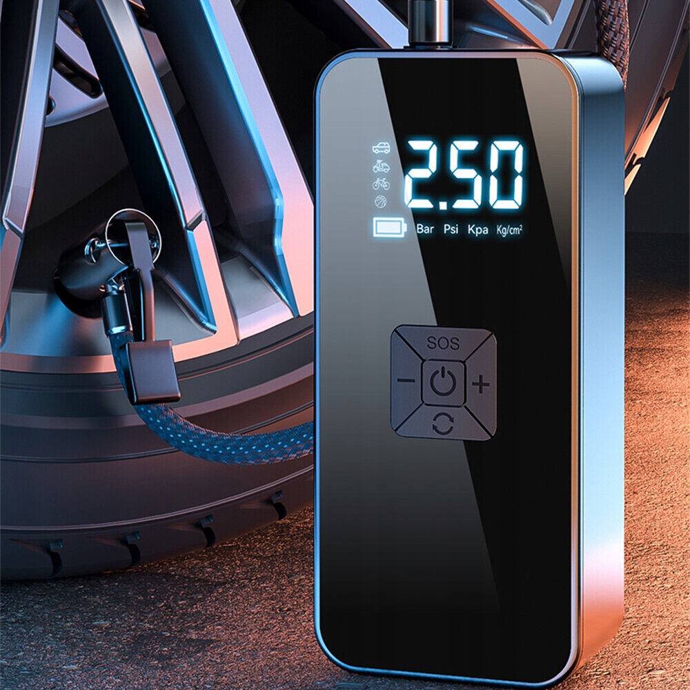 4. Это больше, чем просто насос для шин — это насос для накачивания шин, манометр, аккумулятор и светодиодная аварийная лампа. Идеально подходит для накачивания автомобилей, мотоциклов, велосипедных шин, мячей и других надувных предметов. Цифровой ЖК-дисплей отображает давление в шинах в режиме реального времени. Выход USB 5 В/2,4 А позволяет питать телефон или другие цифровые устройства. Встроенный светодиод с 3 режимами освещения (SOS, постоянный, стробоскоп) делает его полезным в дорожных и ночных чрезвычайных ситуациях.