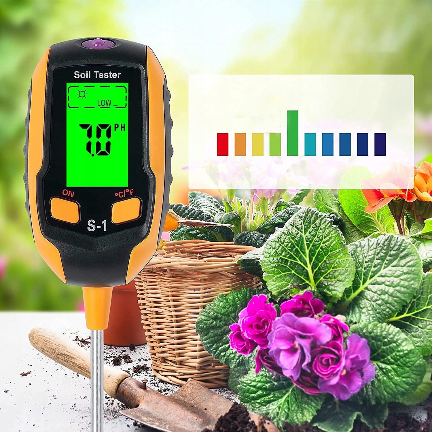 🟢[МНОГОФУНКЦИОНАЛЬНОЕ ИЗМЕРЕНИЕ]: 🌱 Измеряет солнечный свет (9 уровней), влажность почвы (5 уровней), pH почвы (12 уровней) и температуру (°C и °F), идеально подходит для садовых проектов.