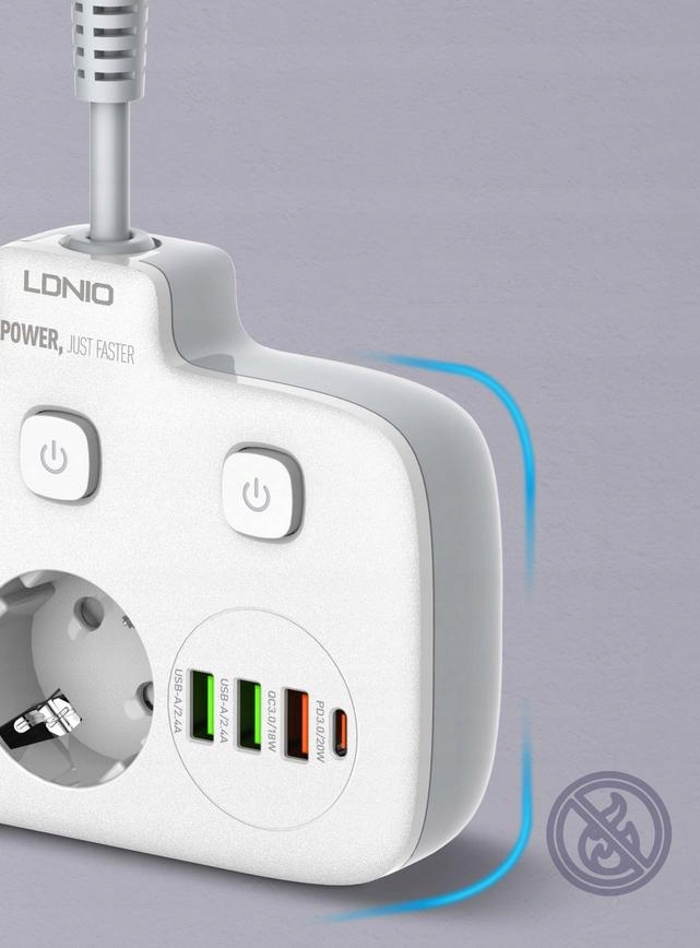 LDNIO SE2435 — устройство, позволяющее питать различное электрооборудование. Кроме того, он позволяет быстро и удобно заряжать аккумуляторы портативных устройств, таких как смартфоны, планшеты и другие гаджеты. Удлинитель оснащен 1 портом USB-C PD, 1 портом USB QC 3.0 и 2 портами USB Auto-ID, поэтому к нему можно подключать большинство популярных устройств. Одновременно можно подключить до 6 устройств. Зарядное устройство также имеет функции PD и Quick Charge 3.0, а это значит, что устройство способно быстро и эффективно заряжать аккумуляторы большой емкости. Удлинитель имеет кабель длиной 200 см, а в задней стенке имеются отверстия для подвешивания, что позволяет разместить его где угодно.