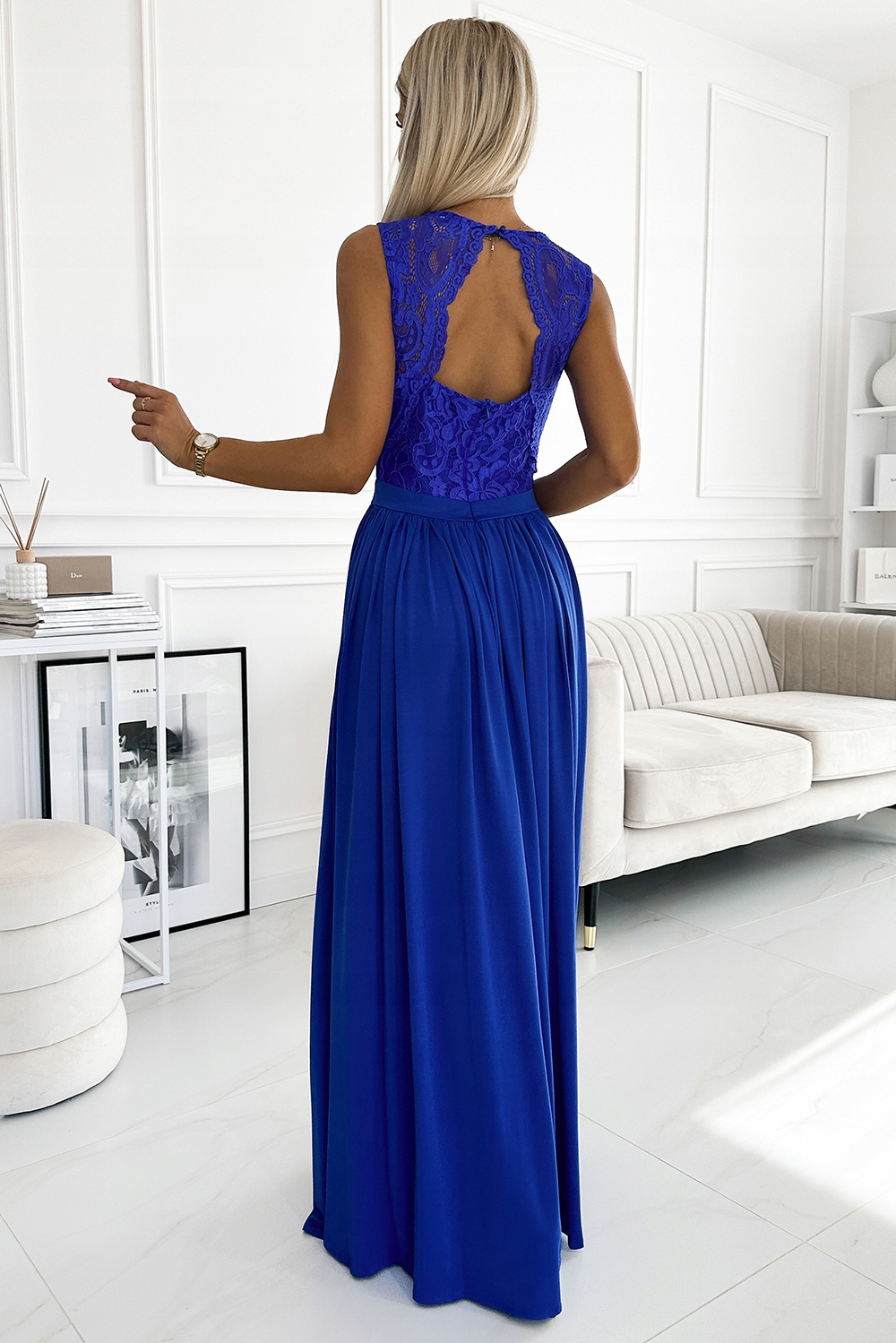 Синее длинное платье Макси с кружевным вырезом и открытой спиной.