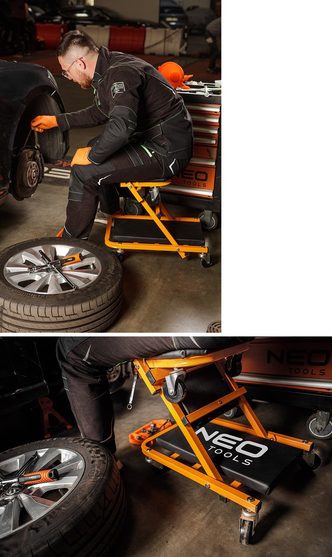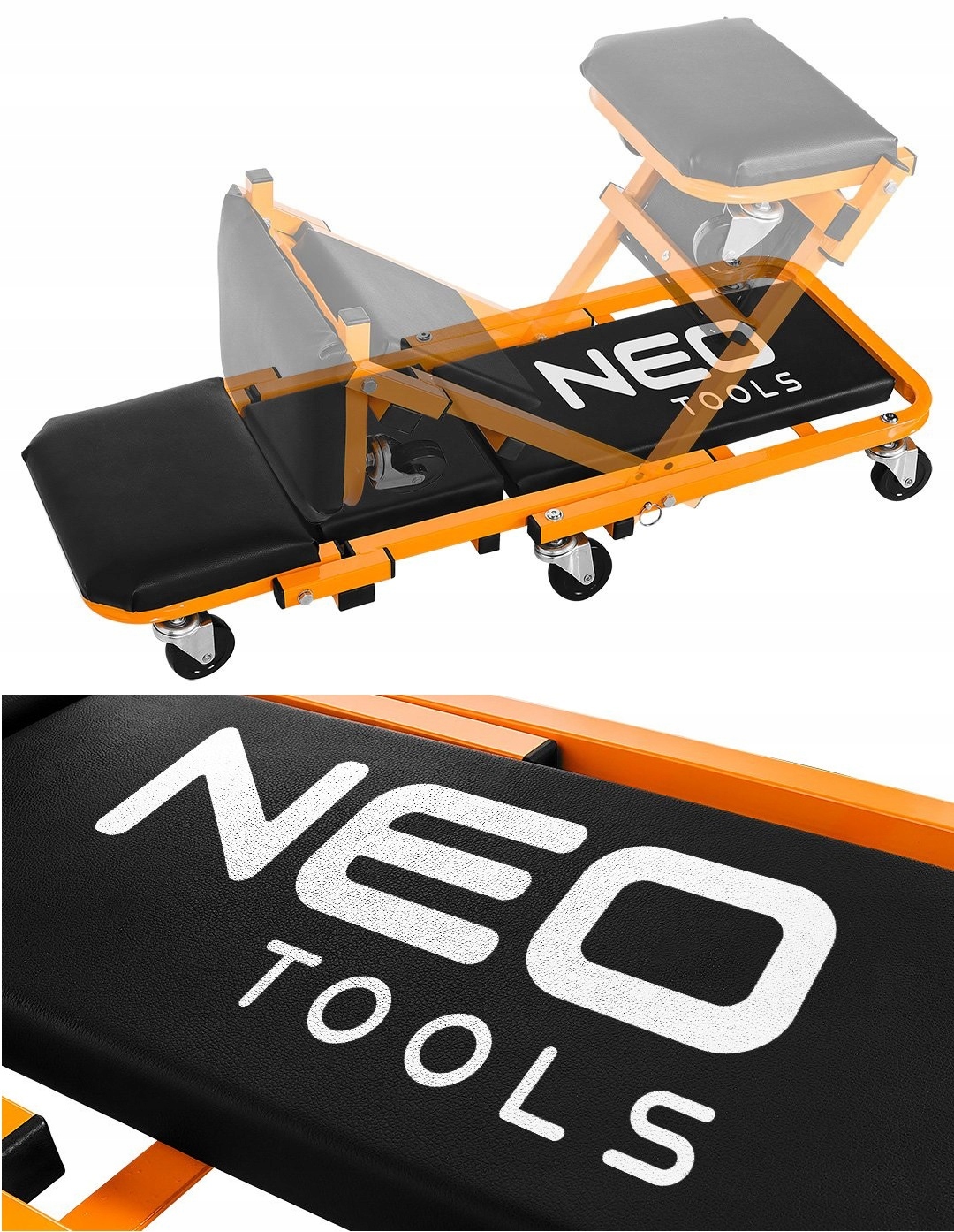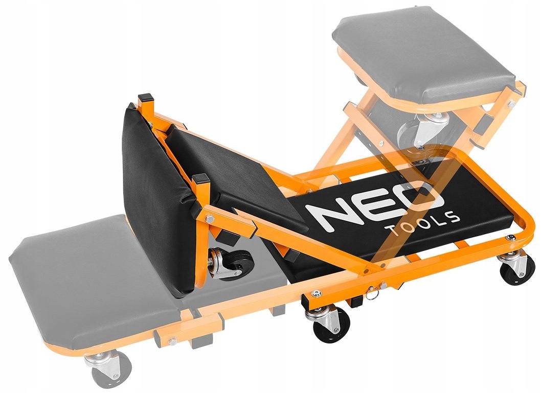 Многозадачный диван для мастерской 2-в-1 от NEO – незаменимый аксессуар для мастерской, позволяющий удобно выполнять работы как под автомобилем, так и в положении сидя, трансформируя диван в табуретку