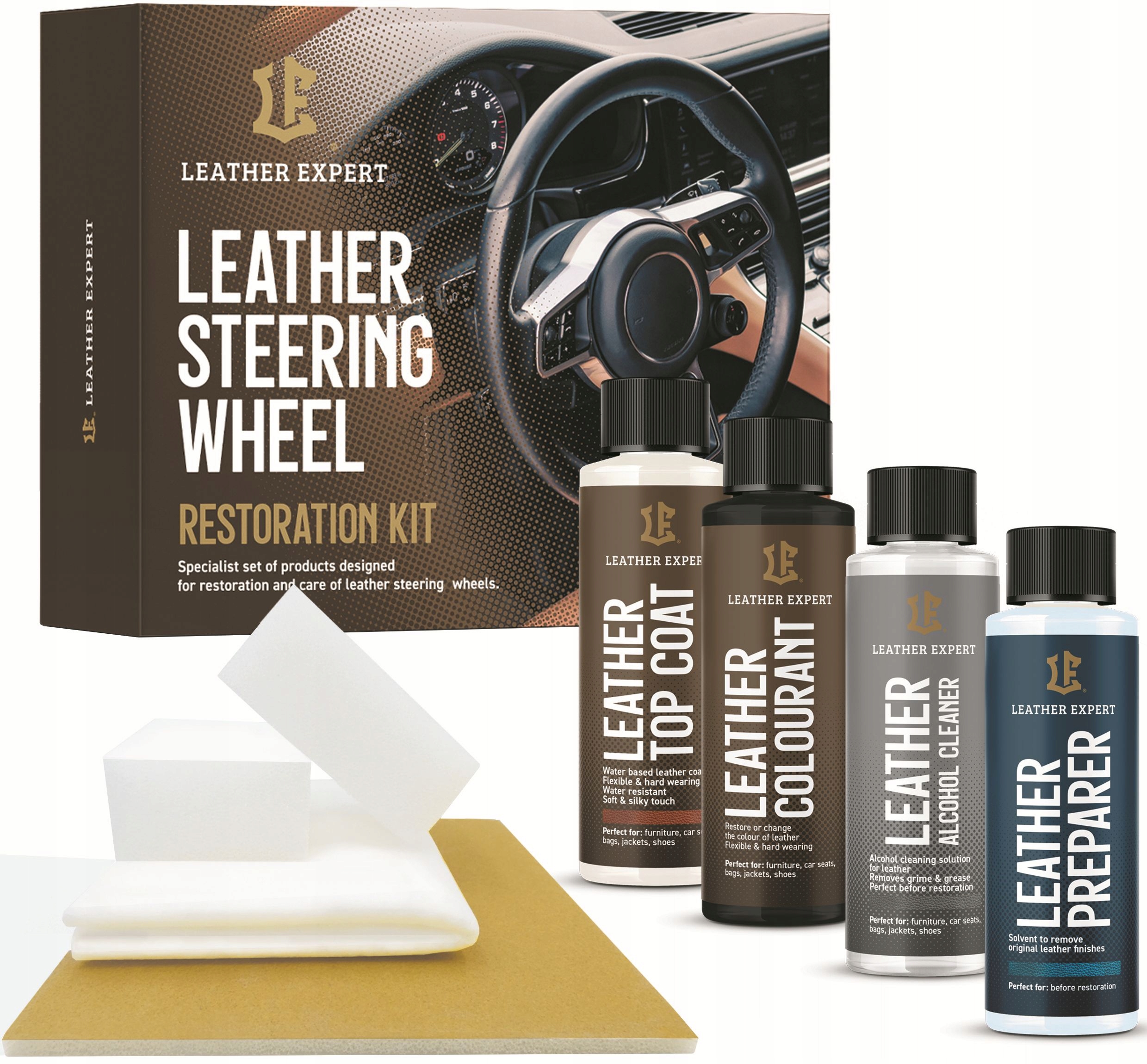 Набор для восстановления кожаного руля — набор профессиональных и эффективных средств, предназначенных для восстановления руля, сидений и других кожаных элементов. Набор готов к немедленному использованию. Он оснащен изделиями высочайшего качества и всеми необходимыми инструментами для ремонта рулевых колес.