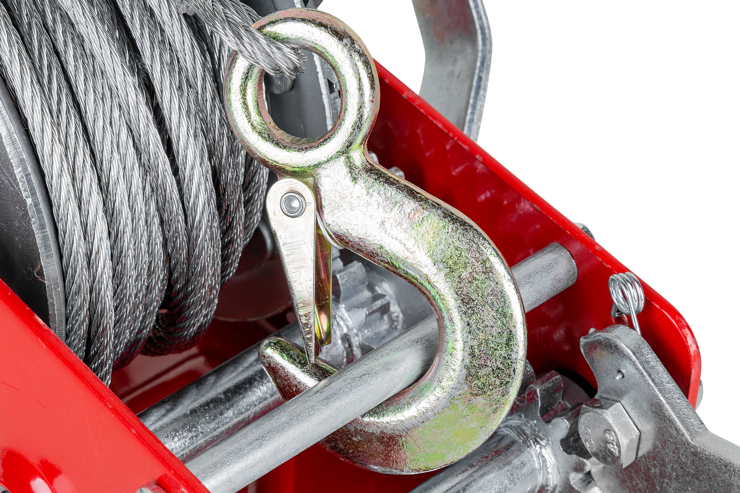 В лебедке используется прочный и долговечный стальной трос длиной 10 м, снабженный прочным крюком с защитой от случайного высвобождения груза.