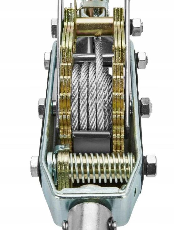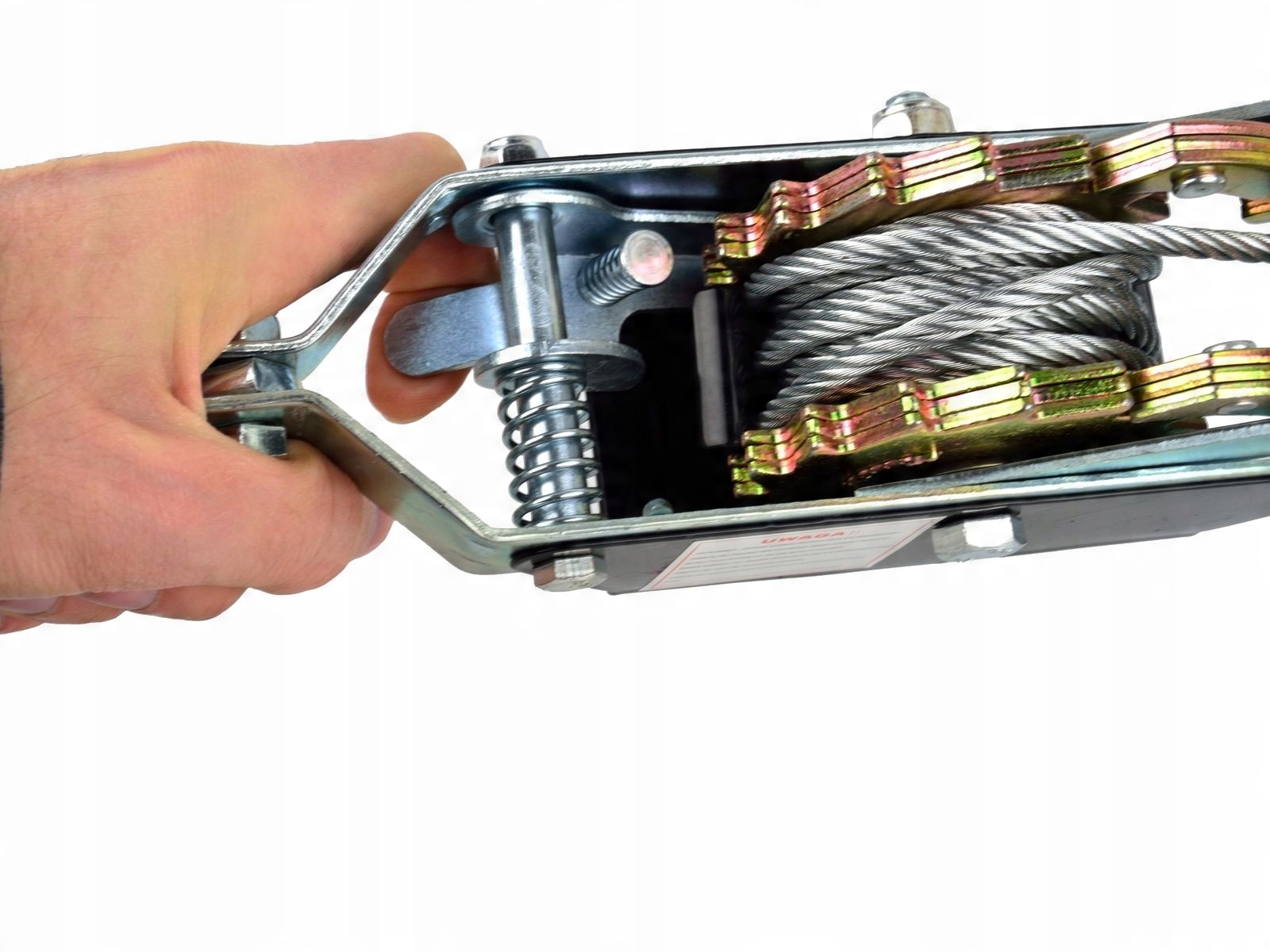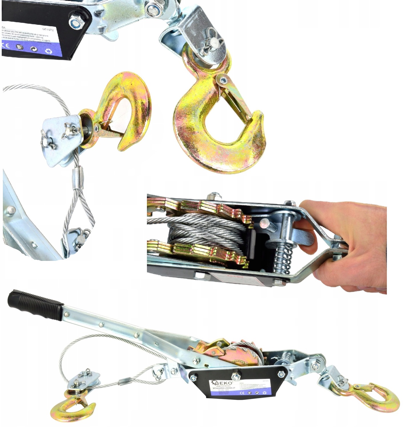 Лебедка ручная канатная горизонтальная. Лебедка оснащена 2-режимным запирающим механизмом, стальным тросом диаметром 4,5 мм и длиной 2,5 м, что в сочетании с прочными крюками создает тяговое усилие 2000 кг.
