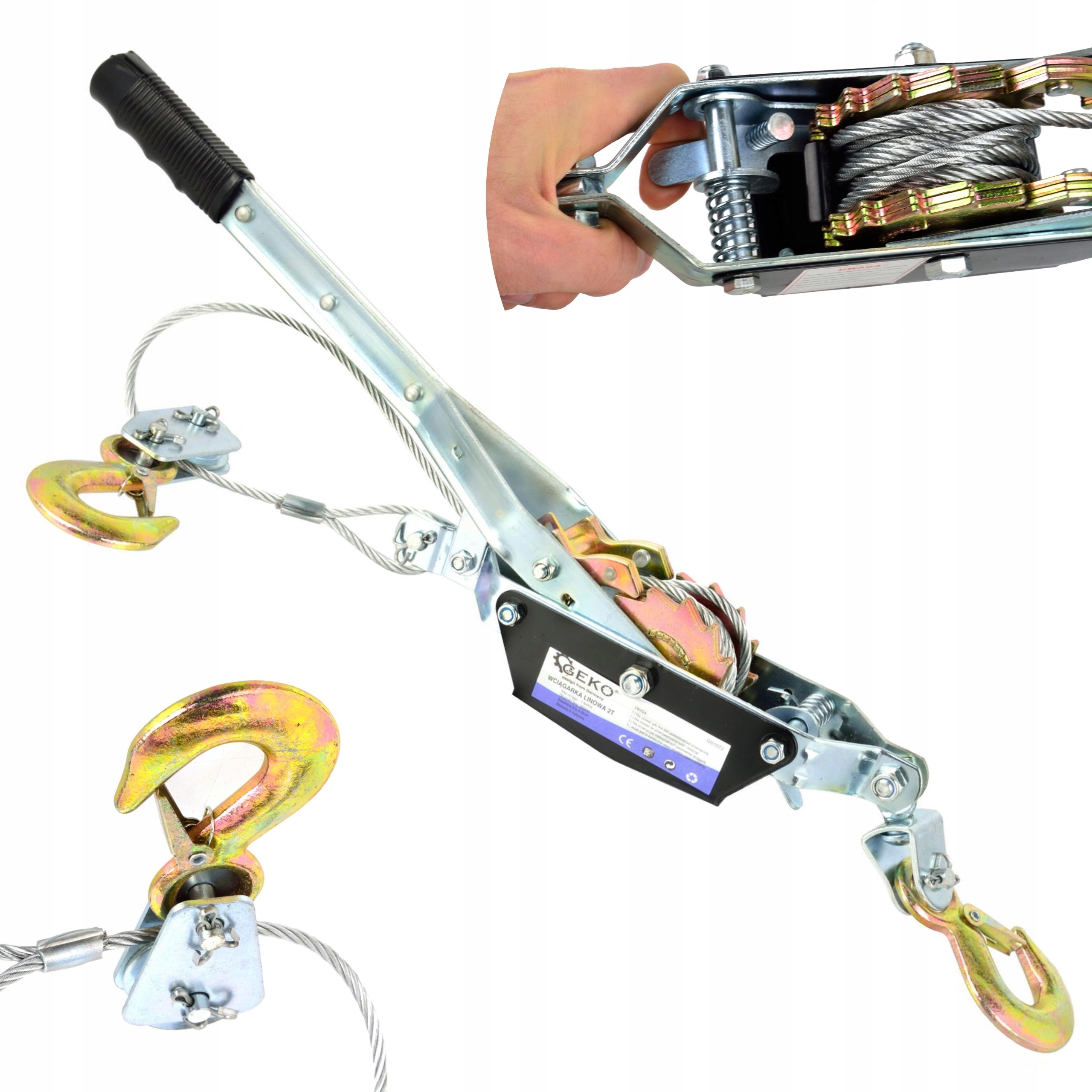 Лебедка ручная горизонтальная тросовая. Лебедка оснащена 2-режимным запорным механизмом, стальным тросом диаметром 4,5 мм и длиной 2,5 м, что в сочетании с прочными крюками создает тяговое усилие 2000 кг.