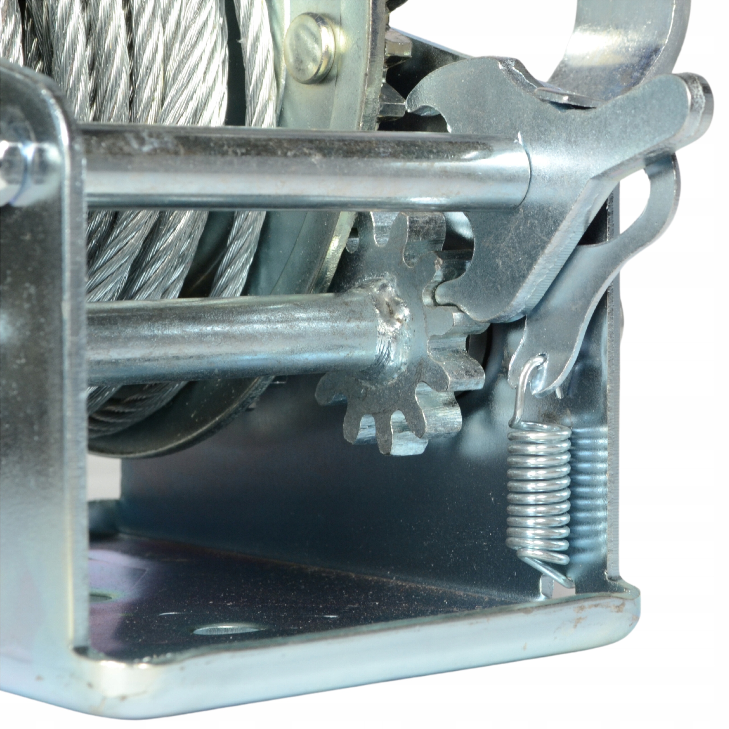 Лебедка оснащена легкодоступным рычагом, позволяющим менять направление движения. вращение - как наматывающее, так и наматывающее, а также развивающее. Высокое качество изготовления и долговечность достигнуты благодаря использованию стальной конструкции и литого крючка с храповой пружиной.