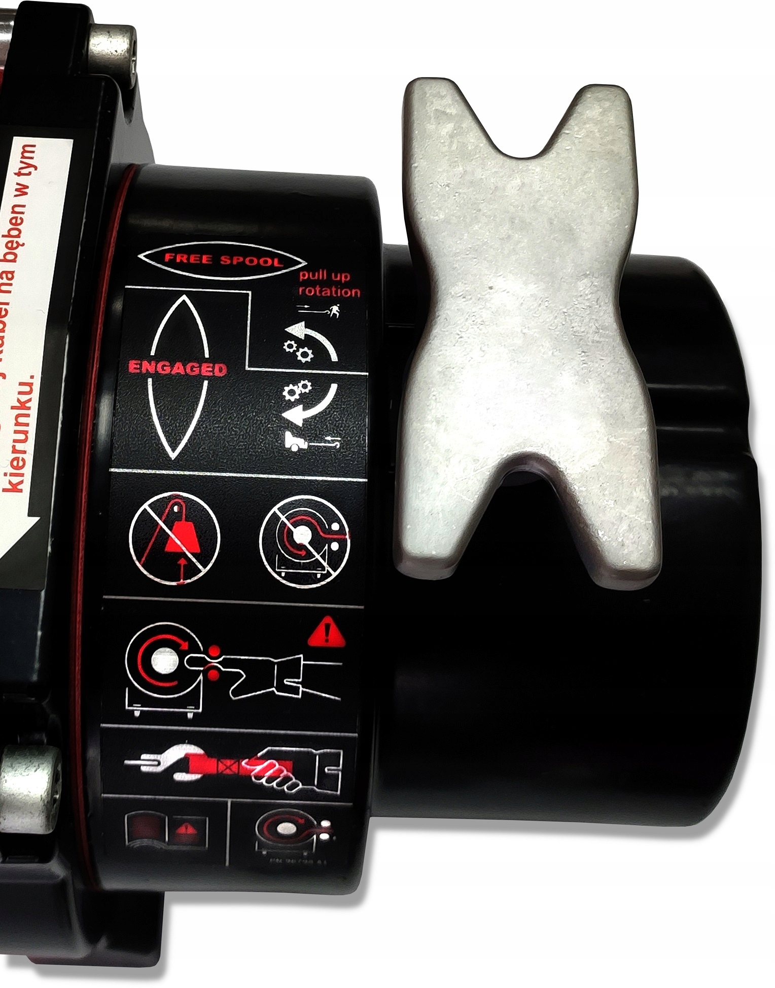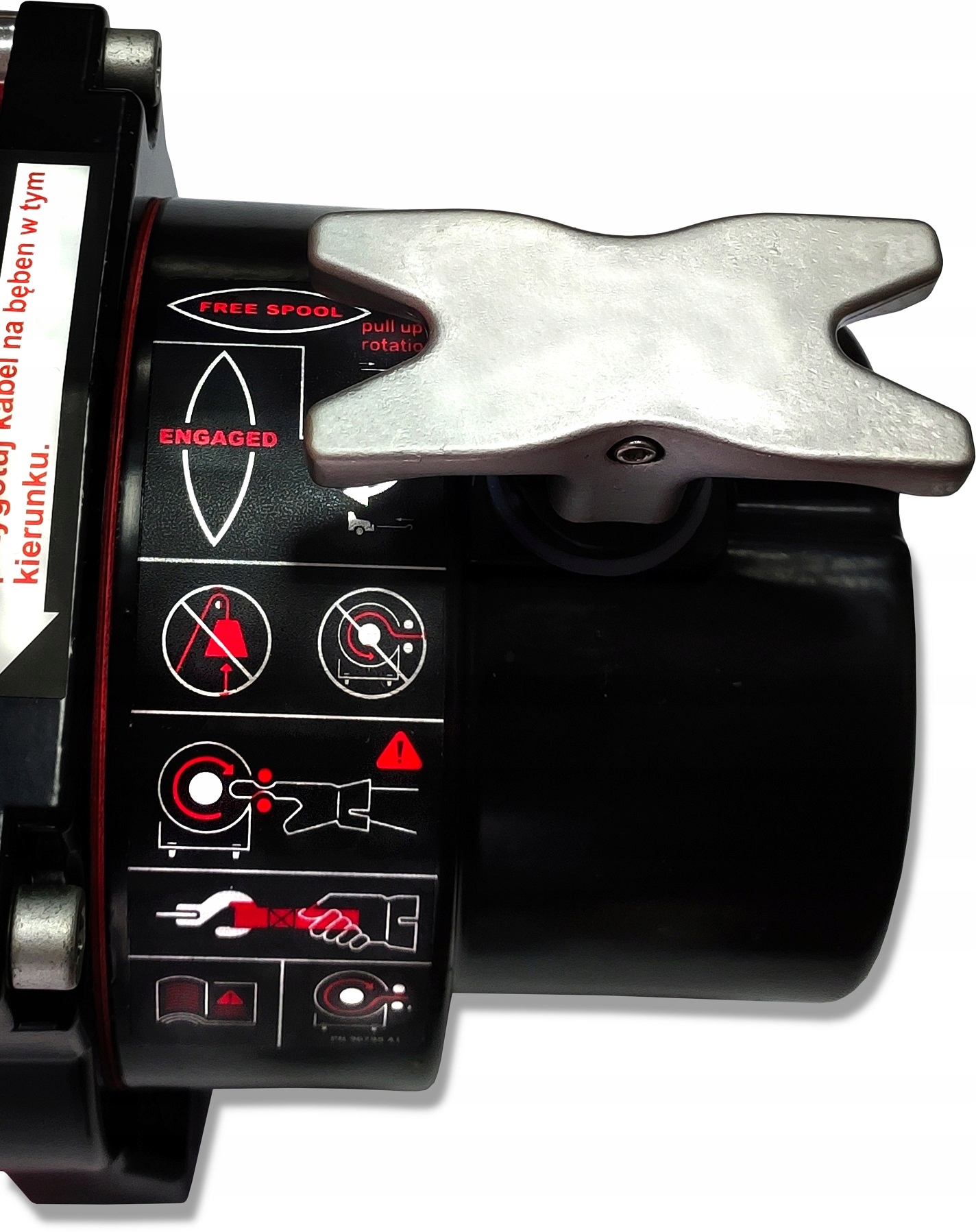 - Лебедка имеет b>систему сцепления со свободным золотником - т.е. возможность «ввести слабину» - поворотом боковой ручки вверх , затем поворачивая его в горизонтальное положение (FREE SPOOL) и набрасывая обратно на привод (ENGAGED) в вертикальное положение. Это позволяет легко вручную вытягивать канат из барабана. (как на фотографиях ниже)