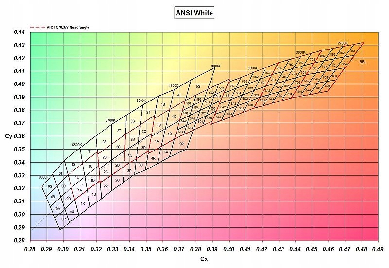 Ниже приведена таблица цветов освещения в стандарте ANSI C78.377-2008
