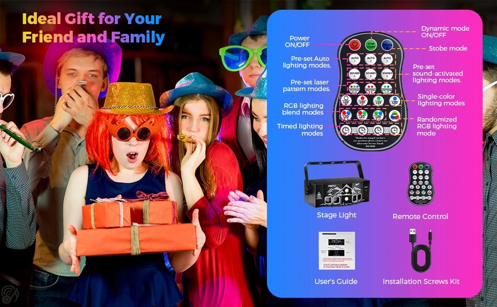 Улучшенное освещение для вечеринки — ключ к превращению вашего мероприятия в визуальную феерию. Шесть ослепительных сценических огней RGBW освещают ваше мероприятие широкоугольной панорамной вспышкой, отображая завораживающую цветовую палитру фона RGBW, удивительные лучи и динамические узоры, и все это на основе эффективных светодиодов и передовой проекционной технологии высокого разрешения. Пусть ваша вечеринка засияет с помощью этих ярких визуальных эффектов!